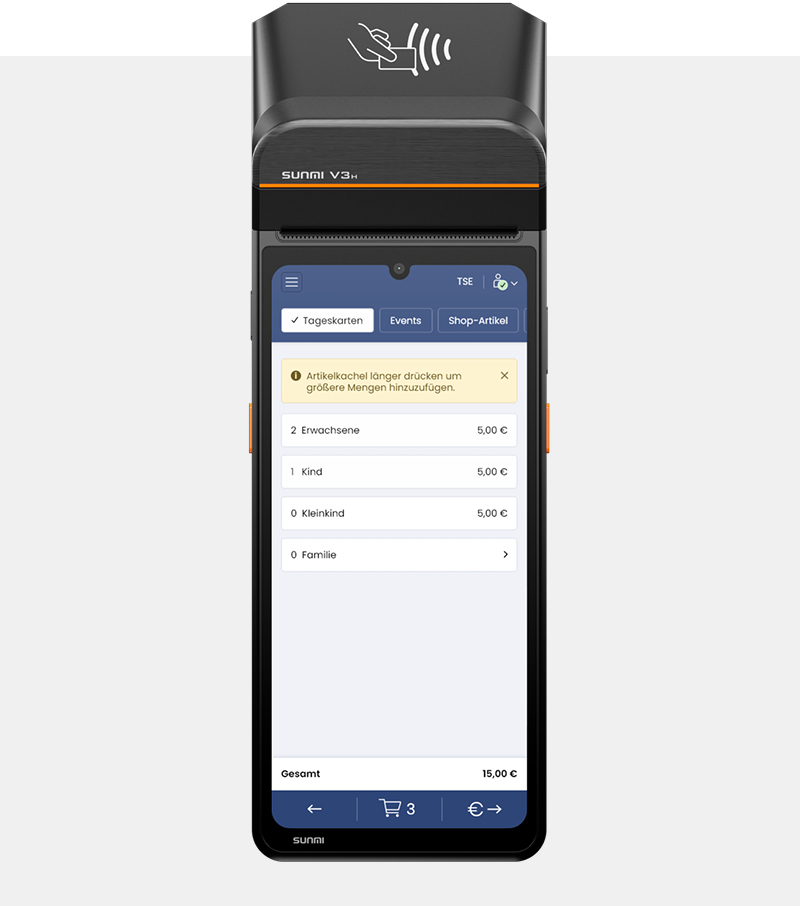 Die mobile Kasse MIA 2 ist in das Kassensystem TOP3 integriert und ermöglicht den Verkauf von Eintritts- oder Fahrkarten sowie Shopartikeln wie Souvenirs oder Snacks und Getränke.